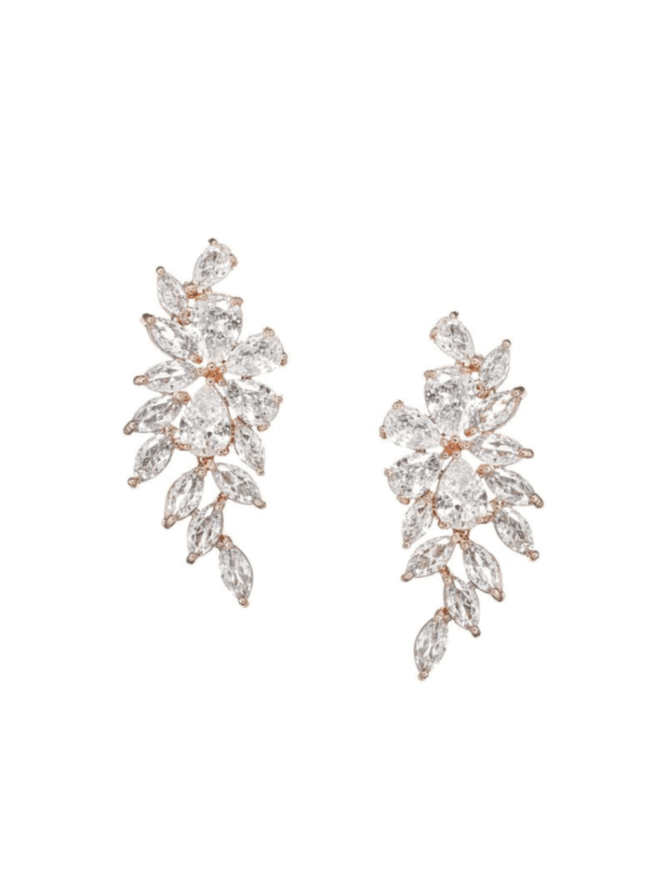 Te śliczne kolczyki w kolorze różowego złota składają się z oszałamiającego układu błyszczących sześciennych cyrkonii. Pokryte różowym złotem kolczyki będą błyszczeć w tym wyjątkowym dniu i dodadzą wykończenia do stroju ślubnego. Kolczyki mierzą 3,5 cm długości. Kolczyki są również dostępne w kolorze srebrnym.