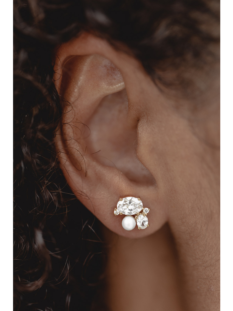 These extraordinary stud earrings combine the best of two worlds: classic pearls and modern crystals, glamorous materials and an extravagant design. The focus is on two larger oval crystals and a classic freshwater pearl, flanked by two small round crystals.
