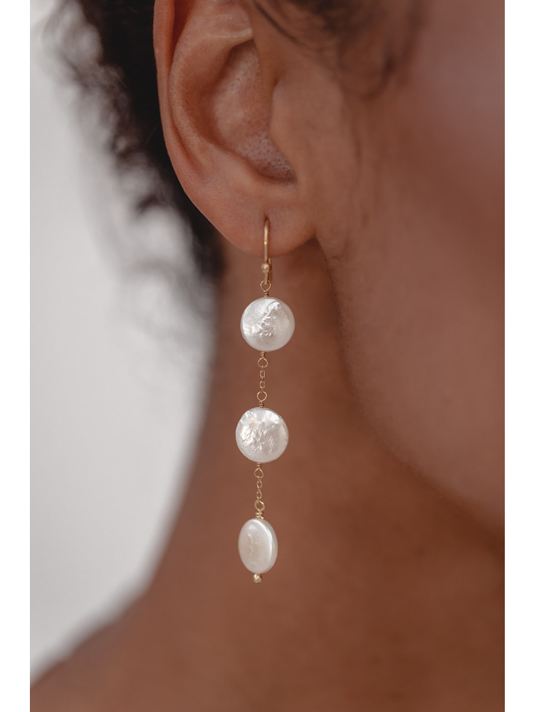 These long hanging earrings feature a contemporary trio of coin-shaped "coin" beads. The beads are linked by delicate chains, providing extra movement and enhancing any bridal ensemble.