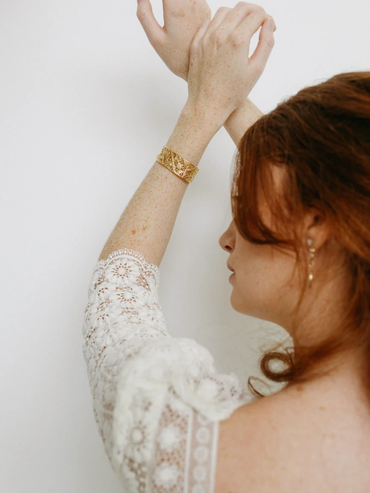 Ta bransoletka została wykonana z mosiądzu i ma skomplikowany wzór stworzony w francuskiej pracowni. Jest pokryta cienką warstwą złota, co nadaje jej luksusowy blask odpowiedni na każdą okazję.