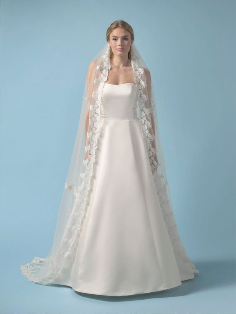 Ten elegancki welon w kolorze kości słoniowej od Poirier dopełni Twój ślubny look. Ten jednowarstwowy welon jest wykonany z miękkiego tiulu, ozdobiony haftowanymi kwiatami wokół krawędzi i aplikacjami rozrzuconymi po całym welonie. Długość welonu wynosi 280 cm (dostępny jest także welon o długości 150 cm).