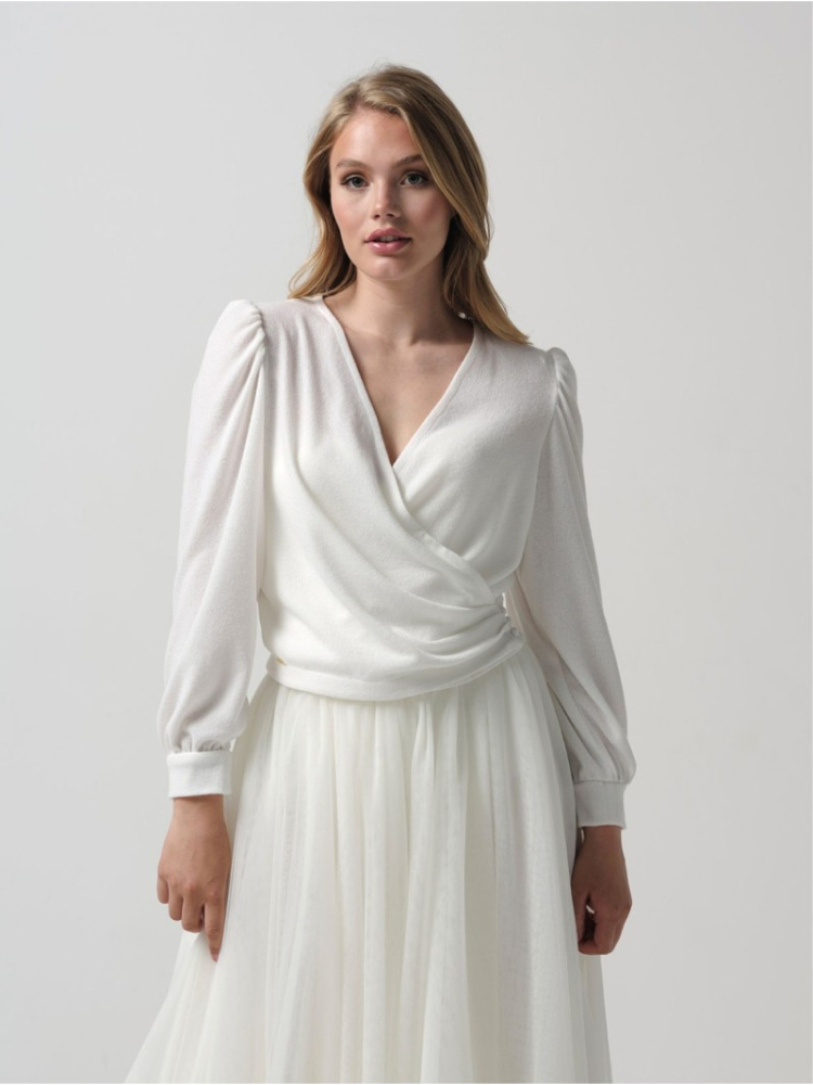 Elegancki top z dekoltem w kształcie litery V z kolekcji Essential marki Poirier. Top jest wiązany z boku i ma długie rękawy. Połącz ten top ze wszystkimi spódnicami ślubnymi Poirier.